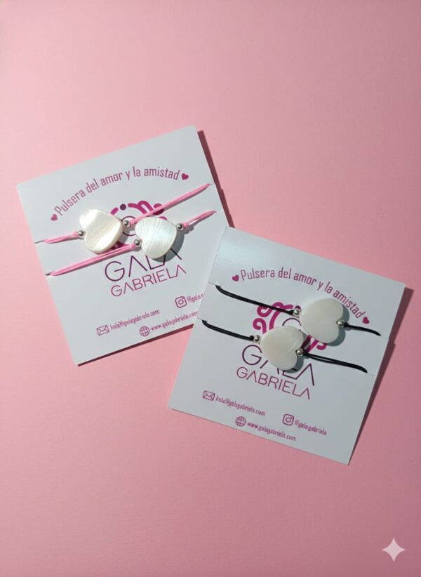 2 Pulseras ajustables, de hilo con puntos de plata y dije de corazón de nacar.